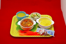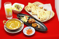 カレー、サラダ、サモサ、ナンorライス、タンドーリチキン・エビ、チキンティッカ、ソフトドリンク、デザート、ババル